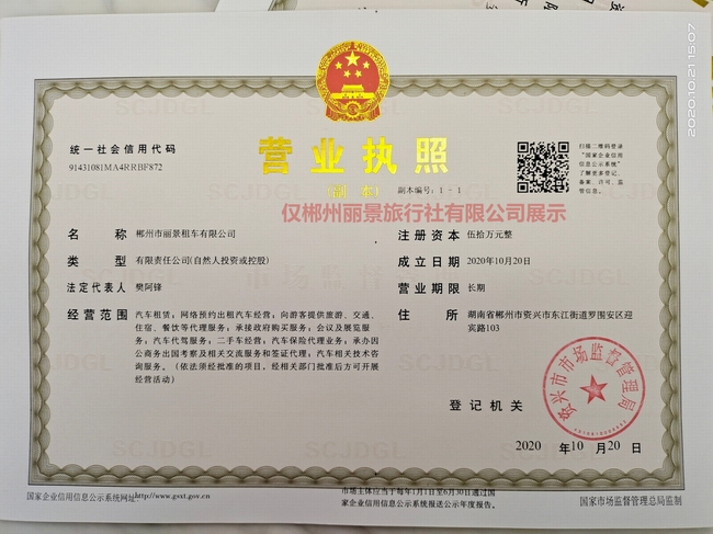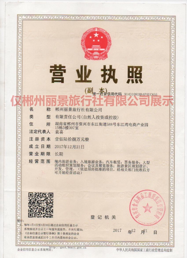 為彰顯誠(chéng)信旅游環(huán)境,讓廣大客戶放心選擇我們,郴州麗景旅行社有限公司公開展示旗下旅游產(chǎn)業(yè)工商信息。用我們的產(chǎn)品讓您的生活更美好!