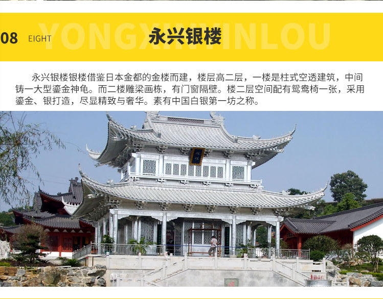 中國(guó)銀都---永興銀樓是中國(guó)白銀城永興的代表作,永興年產(chǎn)銀占全國(guó)三分之一,有著三百年的冶煉歷史,也是中國(guó)唯一一座沒(méi)有銀礦的銀都。