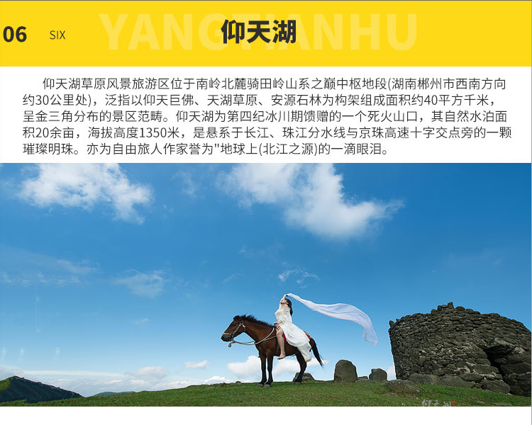 仰天湖南國(guó)高山大草原,是湘南地區(qū)海拔最高的高山草原,有天平天國(guó)烽火臺(tái)舊址、高山梯田、高山云海等自然和歷史景觀是戶外、攝影創(chuàng)作勝地。