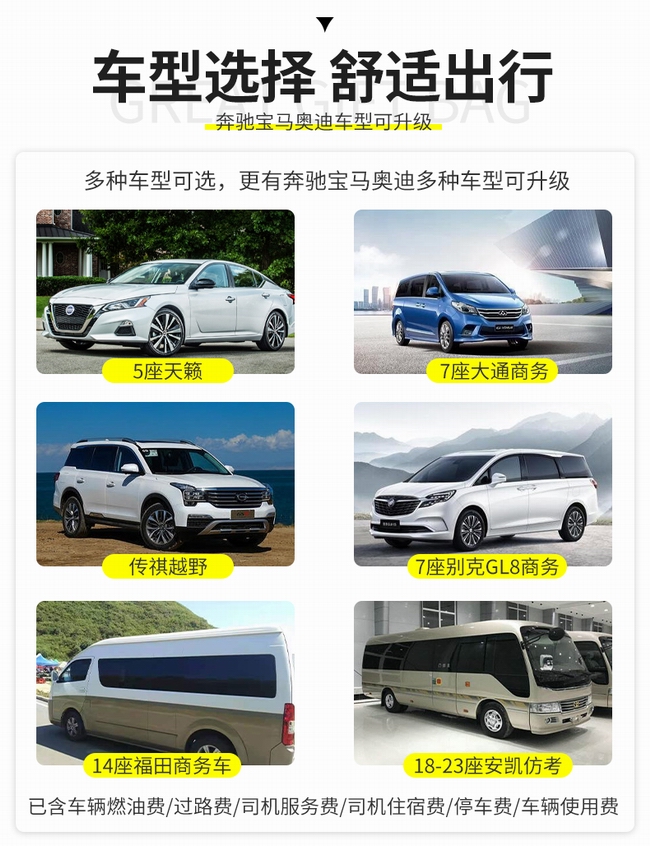 用車:5座舒適性轎車或7-19座小商務(wù)車