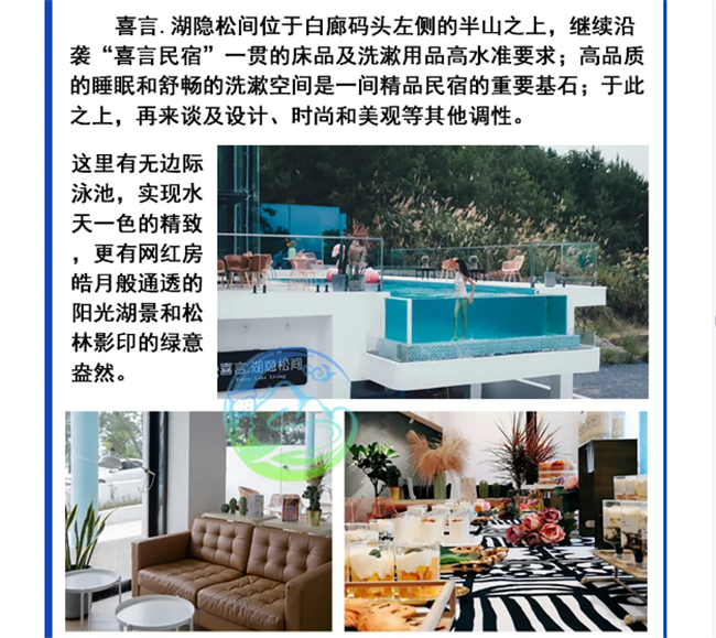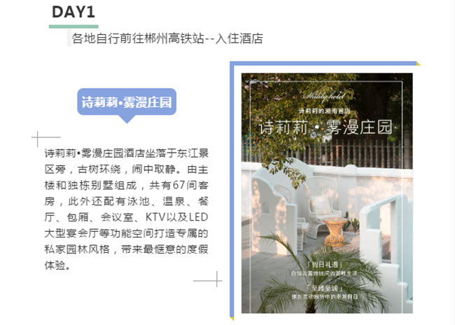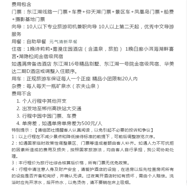 早晨酒店早餐后前往【東江湖景區(qū)】可參觀中華奇觀霧漫小東江,小東江水質(zhì)清澈明凈各項(xiàng)指標(biāo)均達(dá)到了國家一級飲用水標(biāo)準(zhǔn)。每年3-11月,每當(dāng)旭日東升或夕陽西下,整個(gè)小東江云蒸霞蔚,朦朧縹紗,仿佛進(jìn)入仙境。之后乘車前往--東江大壩旅游碼頭。東江湖湖面面積160平方公里,湖面煙波浩淼,平均水深51米,深處達(dá)157米,蓄水量高達(dá)81.2億立方米,相當(dāng)?shù)挠诎雮€(gè)洞庭湖大,因此被譽(yù)為“湘南洞庭”,數(shù)十個(gè)島嶼星羅其中,被稱為“東方瑞士”之后參觀【龍景峽谷景區(qū)】,峽谷內(nèi)有堪稱南國的瀑布群--龍景十八瀑:是國內(nèi)天然氧吧!是我國目前瀑布密集最高的景區(qū),有大小瀑布26處,水潭18個(gè),是國內(nèi)罕見的高負(fù)離子區(qū)。中午自理中餐后前往前往江湖【白廊小洱海最美環(huán)湖公路】,沿途參觀南國生態(tài)休閑漁村,吉尼斯世界大魚鍋。東江湖環(huán)湖路共長14公里是以湖光山色為主的觀景棧道,比千島湖安靜質(zhì)樸堪比美國66號公路,之后乘游船暢游大東江--登【東江湖鳳凰島】位于東江湖西北部,位于東江湖白廊片區(qū)湖的中央,是東江湖能在島頂360度觀湖景的地方。鳳凰島以“動物天堂、人的天堂"為主題,羊駝、孔雀、王松鼠、大嘴鳥、獼猴、珍珠雞、火雞等諸多可愛的動物自然放養(yǎng)其中。在這里你會有各色驚奇發(fā)現(xiàn),可愛的動物隨時(shí)與你不期而遇。特別贈送東江湖最火的【網(wǎng)紅打卡基地】。網(wǎng)紅攝影基地 Get網(wǎng)紅拍照地點(diǎn),輕松稱霸朋友圈讓你享受不用排隊(duì)慢慢拍的自由。晚上晚餐自理,入住鉑金民宿喜言湖隱松間(注鉑金級為民宿最高等級)