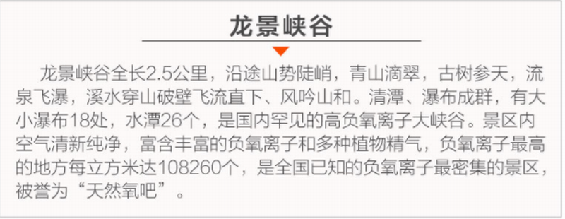 游完乘景區(qū)車抵達(dá)——東江大壩旅游碼頭。東江湖湖面面積160平方公里,湖面煙波浩淼,平均水深51米,最深處達(dá)157米,蓄水量高達(dá)81.2億立方米,相當(dāng)?shù)挠诎雮€(gè)洞庭湖大,因此被譽(yù)為“湘南洞庭”,數(shù)十個(gè)島嶼星羅其中,被稱為“東方瑞士”,之后前往龍景峽谷景區(qū)參觀,龍景峽谷位于東江大壩右側(cè),峽谷內(nèi)有堪稱南國大的瀑布群--龍景十八瀑;是國內(nèi)大的天然氧吧!沿途山勢陡峭,青山滴翠,古木參天,瀑布成群,是我國目前瀑布密集最高的景區(qū),有大小瀑布26處,水潭18個(gè),是國內(nèi)罕見的高負(fù)離子區(qū)。含龍呤瀑、鴛鴦瀑、東江大壩等景點(diǎn)。中餐自費(fèi)品嘗資興特色東江魚。