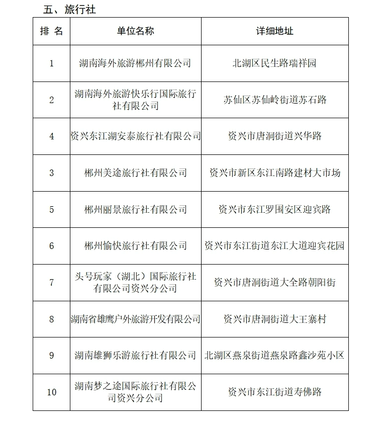 郴州市涉旅行業(yè)2023年第二期創(chuàng)“三零”提“三率”評比活動涉旅企業(yè)排名前10的通報