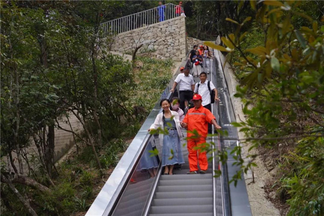 東進(jìn)東出:索道五指峰站→乘坐索道→索道天臺寺站→棧道中線→峽谷餐廳→摩天嶺電梯→棧道上線→小天臺→天臺寺→天臺小徑→棧道中線→索道天臺寺站→乘坐索道→索道五指峰站